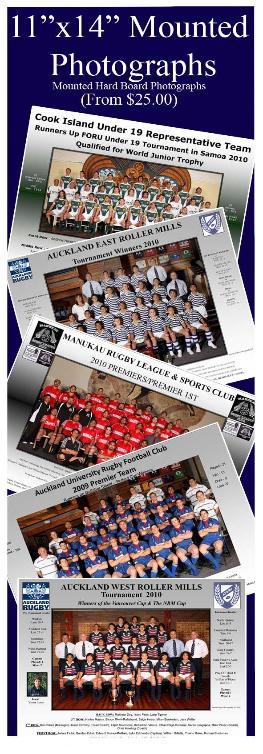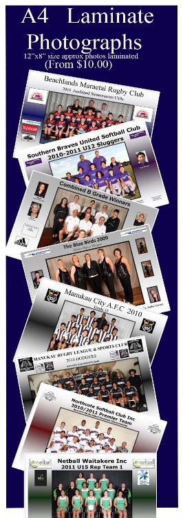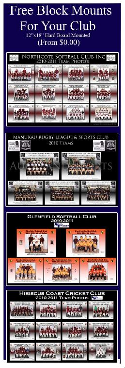 | For High Quality Team Photos for your Sports Club & a friendly Professional service, look no further. Auckland Sports Photography have the best options for you. A4 Fundraising is extremely popular with our large sports club customers. We charge the club $11.00 inc gst or ($9.57 + gst) per A4 Laminate and clubs can add any markup to collect for fundraising. ($5 is the preferred addition for the majority of our clients) We also offer larger 11" x 14" versions which cost $25 each. Fundraising amounts can be added to these at the clubs discretion. Can you think of a better way to provide members with a regular service & make $500+ that benefits the club?? (actual amount is club member numbers dependant) |